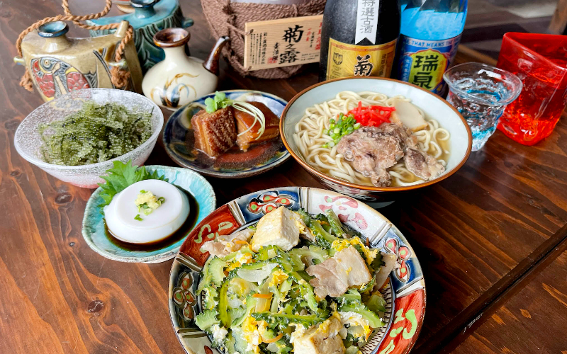 ゴーヤチャンプルーや海ぶどうといった定番の沖縄料理は、地元食材の新鮮さと栄養価の高さを存分に活かしています。セットメニューに加え、豊富なアラカルトや昼飲みメニューの他、季節ごとに変わるメニューは、訪れるたびに違った味わいを楽しめるため、リピーターも多数。